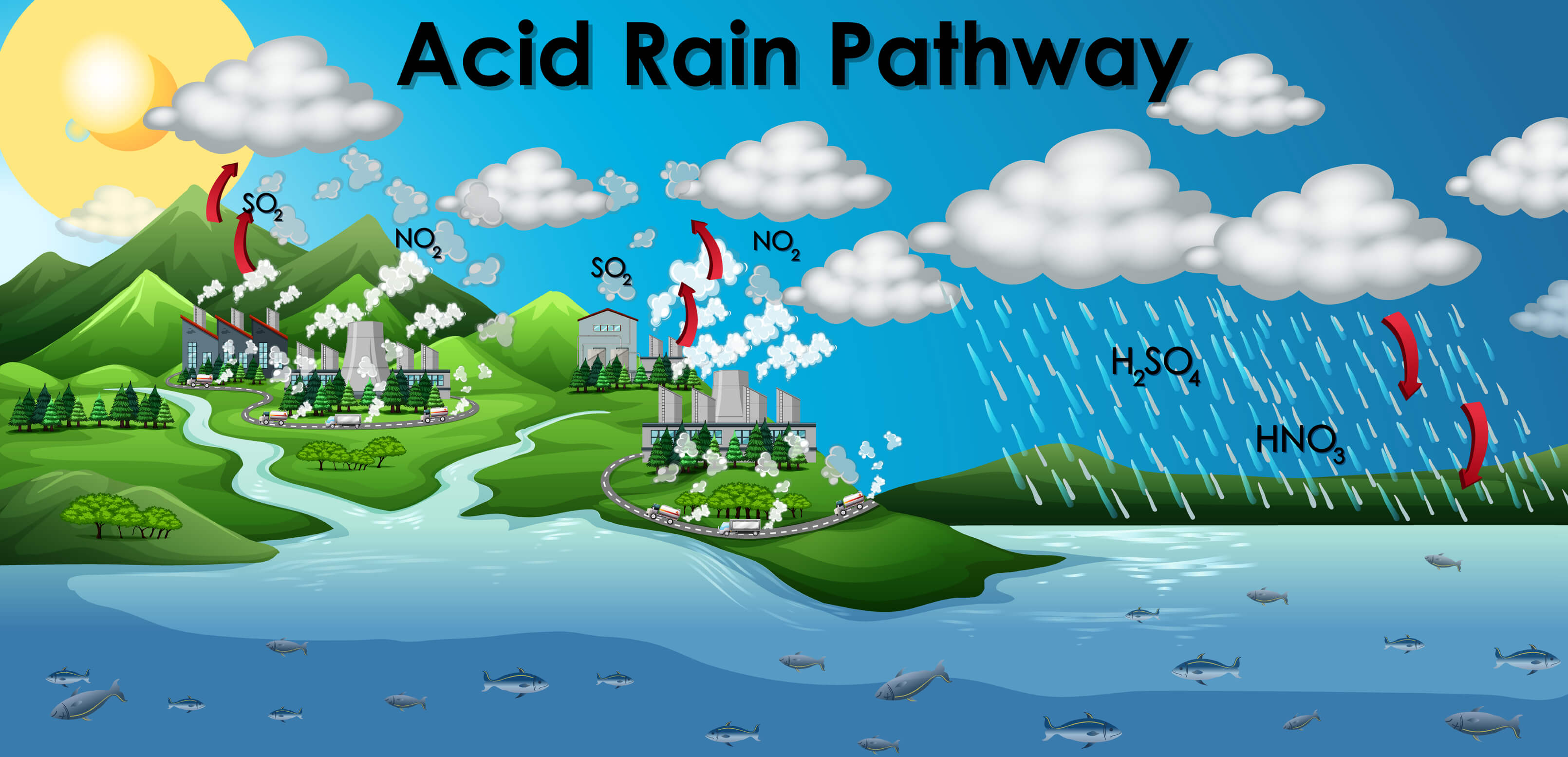 酸性雨とは、二酸化硫黄や窒素酸化物が溶け込んだ強い酸性の雨です。